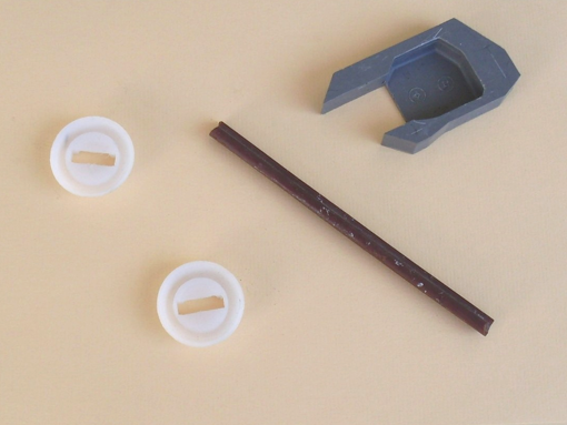 Här ovan några bitar som är förstadier till detaljer som ska tillverkas på annat sätt. De vita bitarna är svarvade och håltagna med riggad stans. Den grå är gjuten av armerad polyester + talk och den långa listen är gjuten i polyuretan-elastomer i siliconform. Dessa detaljer har jag tillverkat själv i egen verkstad.